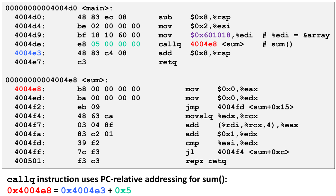main函数起始地址:0x4004d0sum函数起始地址:0x4004e8- 调用指令使用 PC 相对寻址: