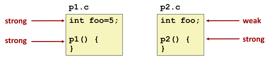 规则二:强弱共存时选择强符号。若存在一个强符号和多个弱符号,采用强符号,所有引用指向强符号定义。