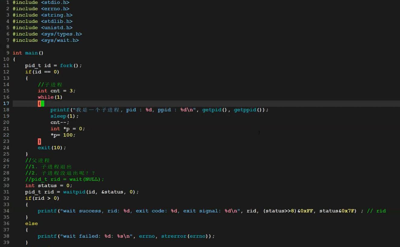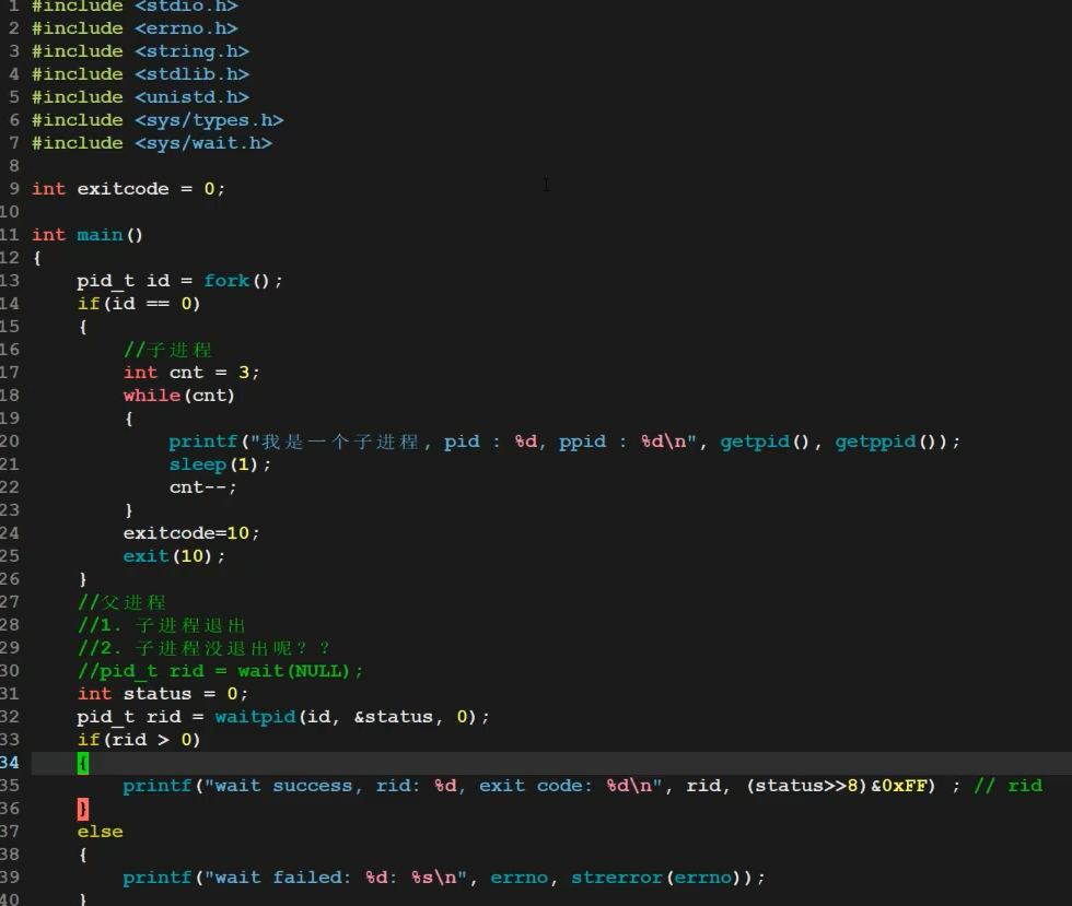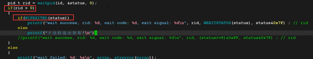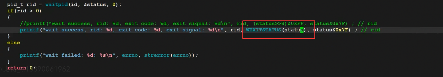 printf("wait success, rid: %d, exit code: %d, exit signal: %d\n", rid, (status>>8)&0xFF, status&0x7F) ; // rid