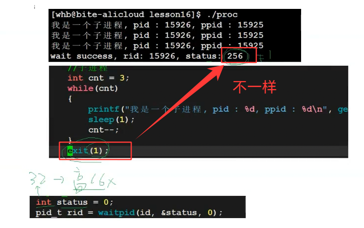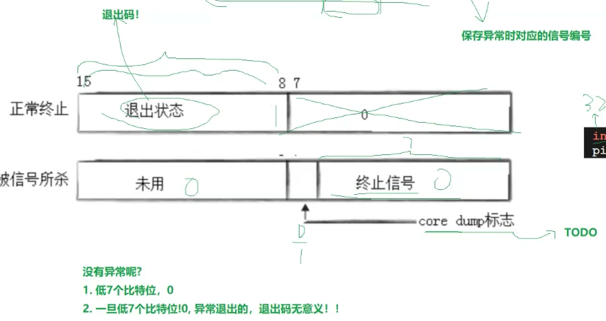 int整型变量一共32位,高16位我们不要,图中位低16位, 前8位位退出码,后8位如果属于征程退出,那么后面就都是0, 所以statux = 1 << 8 == 256,而不是 1.也就是说正常终止,我们要获取退出码需要把status >> 8,才可以得到