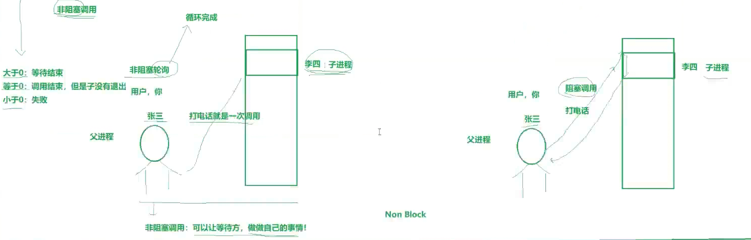 WNOHANG:wait no hang ,等的时候不要挂住 --- 非阻塞调用。