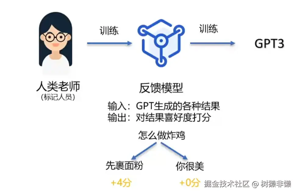 结果: 得到一个能模拟人类偏好的"奖励模型",它可以自动给任何回答打分。