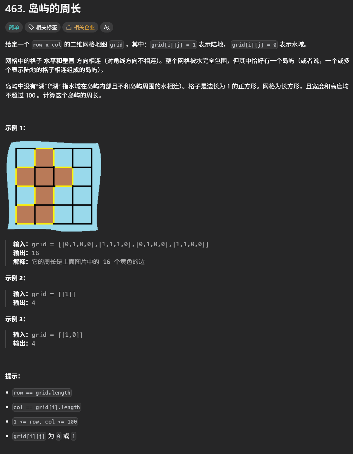 将这个相邻关系对应到DFS遍历中,就是:每当在DFS遍历中,从一个岛屿走向一个非岛屿方格,就将周长 + 1。代码如下所示。