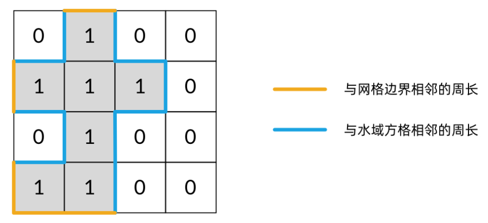 (6)如何在DFS遍历时求岛屿的周长:求岛屿周长的方法很多,如果用DFS遍历来求的话,有一种很简单的思路,那就是岛屿的周长就是岛屿方格和非岛屿方格相邻的边的数量。这里的非岛屿方格既包括水域,也包括网格的边界,如下图所示。