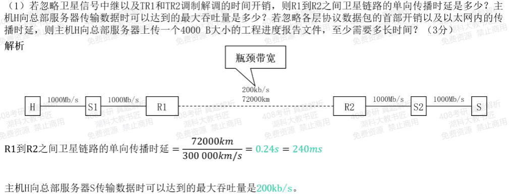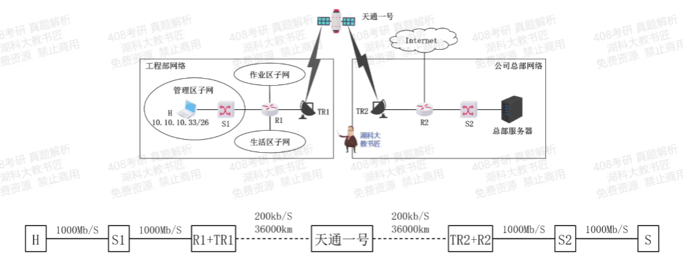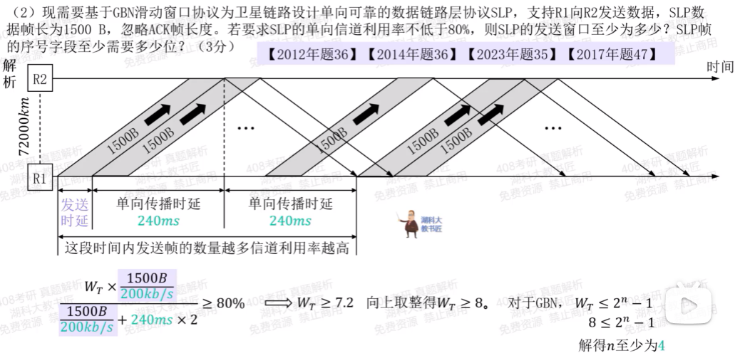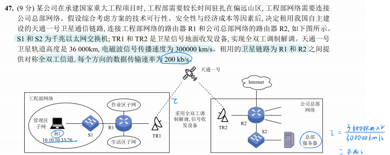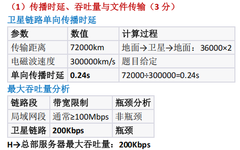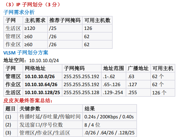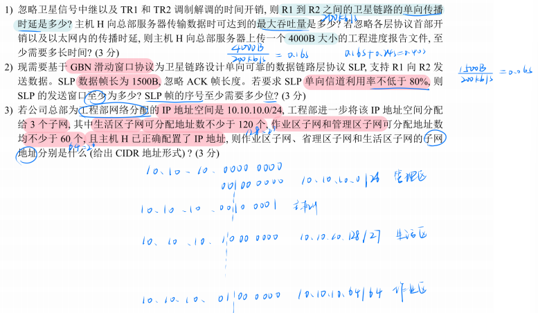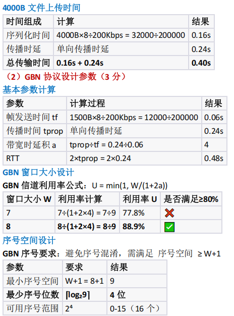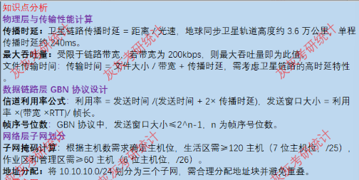 跨层综合设计:卫星链路的传播时延计算(如240ms)GBN 协议窗口大小设计(利用率≥80% 时窗口≥8)、子网划分(根据主机数分配/25、/26 等子网掩码)