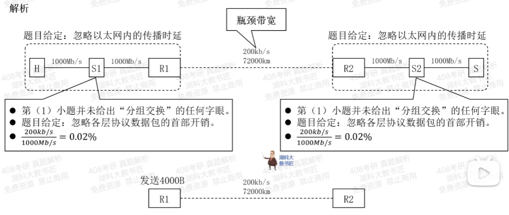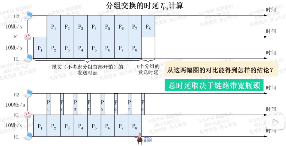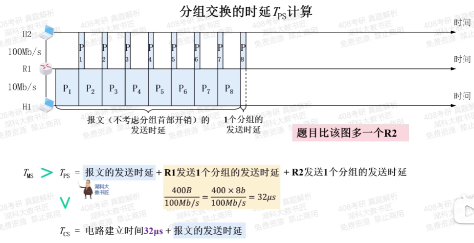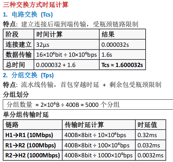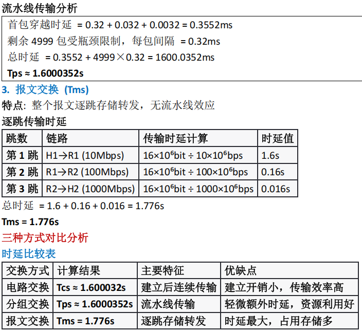 传输时间 16×10⁶bit/10Mbps=1.6s → 总 ≈1.600032s;- 分组交换( Tps ):首包穿越时延 0.3552ms + 4999×0.32ms≈1.6000352s;