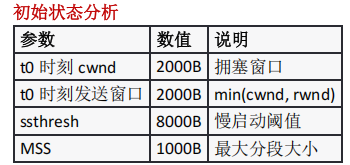 - 初始 cwnd=2000B ( 2 个 MSS ), t1 收到 ack_seq=3001 ( 1 个 MSS 确认),cwnd+=MSS=3000B;