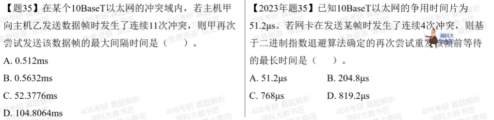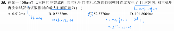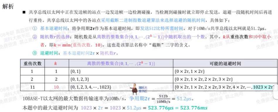2. 10BaseT 槽时间 = 51.2μs ,最大等待时间 = 1023×51.2μs=52.3776ms;