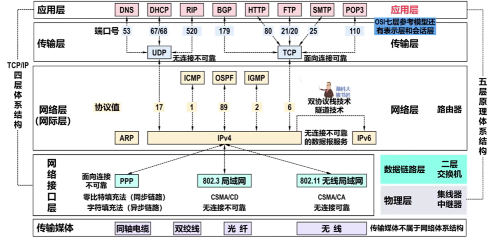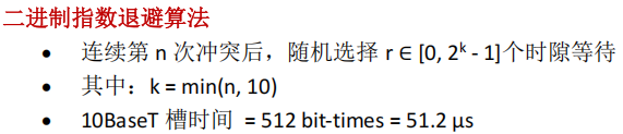 介质访问控制:以太网 CSMA/CD 的二进制指数退避算法(第n次冲突后,退避时隙范围 0~2^n-1)
