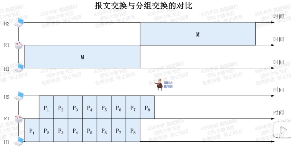 传输方式比较:电路交换、报文交换、分组交换的时延差异(如分组交换因并行传输耗时最短)