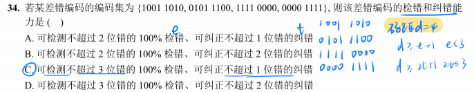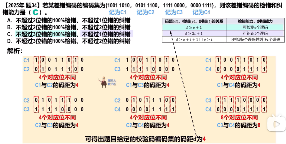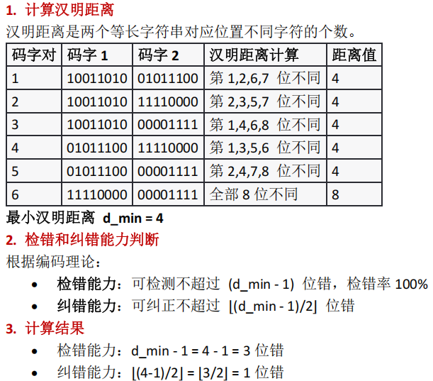 差错控制:通过汉明距离计算检错纠错能力(最小汉明距离 dmin=4时,检错3位、纠错1位)