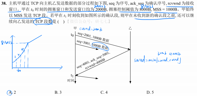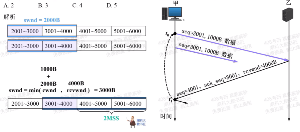 - 在途数据 = 1000B (未确认的 1 个 MSS),可发送 = 3000-1000=2000B→2 个 MSS;