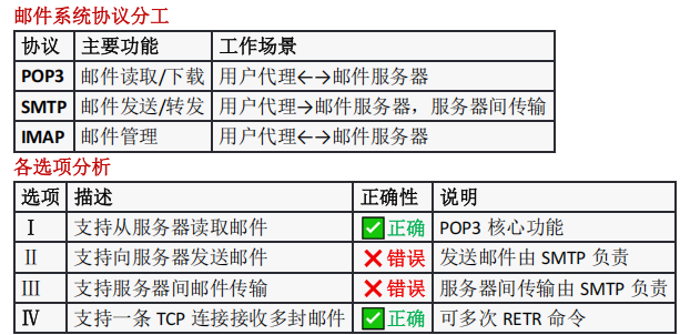 POP3 协议的核心功能(邮件读取、TCP 连接特性)与协议分工(SMTP的功能区别)