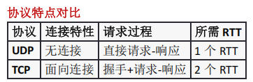 UDP 与 TCP 的请求响应时间差异(RTT 数量:无连接 vs 面向连接)