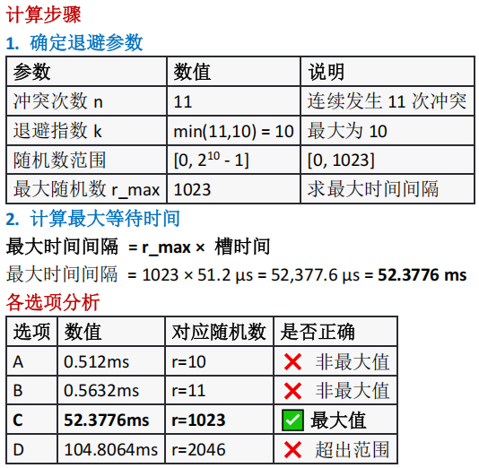 1. 连续 11 次冲突,退避指数 k=min (11,10)=10,最大随机数 r_max=2¹⁰- 1=1023;