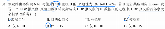 - 不修改:Ⅱ(目的端口号,外网服务端口不变)、Ⅲ(总长度,UDP 载荷无变化);选 B