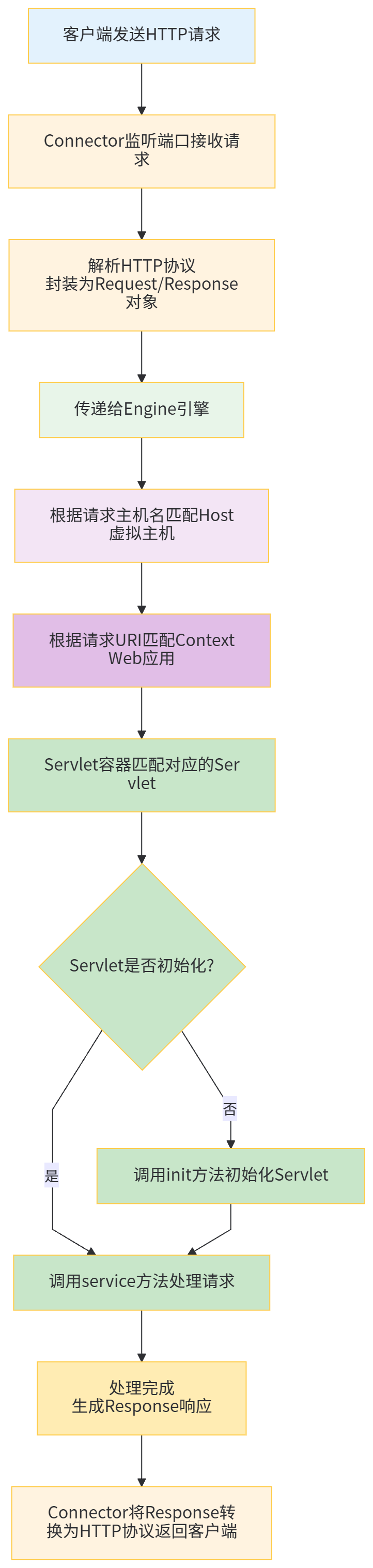 Connector(连接器)是Tomcat与客户端通信的入口,负责监听指定端口、接收客户端请求、解析请求协议(HTTP/1.1、AJP、HTTP/2等),并将解析后的请求封装为Tomcat内部的Request对象,传递给Engine处理;同时将Engine返回的Response对象转换为客户端可识别的协议格式,返回给客户端。