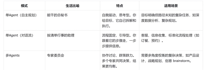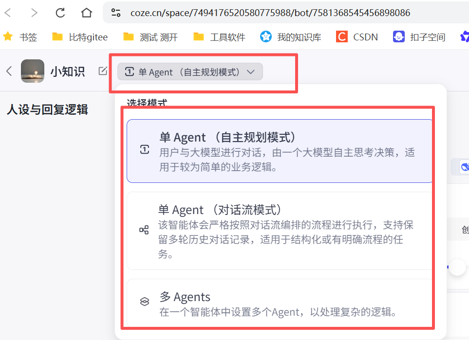 智能体模式选择:一共有三种选择,单Agent(自主规划模式)、单Agent(对话流模式)和多Agents模式
