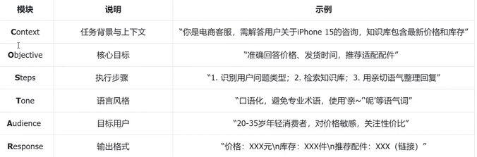 优质提示词需清晰定义角色、目标、约束、流程、示例,推荐使用CO-STAR框架: