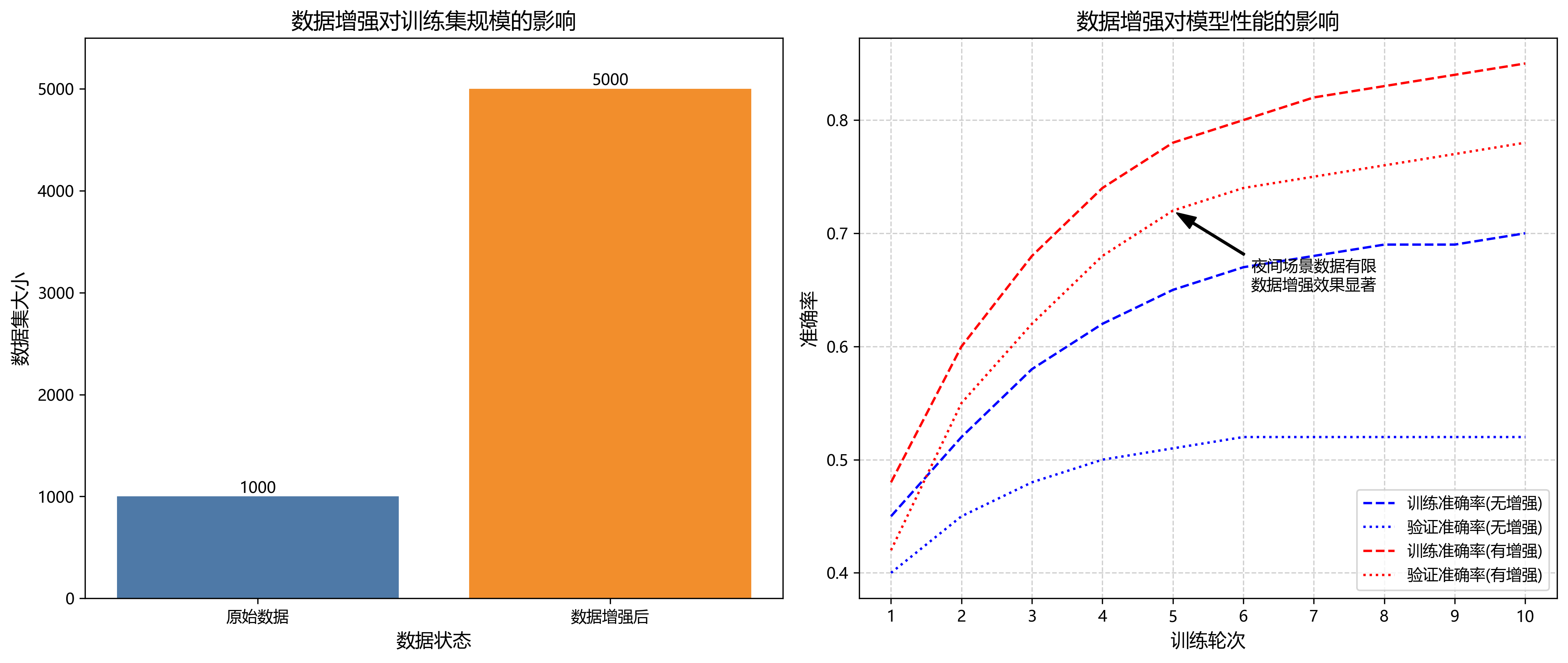 数据增强技术能够有效扩大训练集规模,减少过拟合现象,特别是在夜间场景数据有限的情况下,数据增强对于提升模型性能尤为重要。
