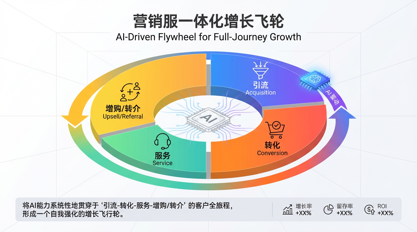服务与增购阶段 (Serve & Grow): 客户签约后,AI自动化跟进流程,并智能挖掘客户的增购或亲友转介潜力,提升客户终身价值(LTV)。