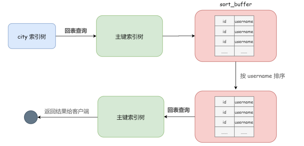 可以看到,新的 rowid 算法放入 sort_buffer 的字段,只有要排序的列(即 username 字段)和主键 id。但有利有弊,存放在 sort_buffer 中的数据因为少了 city 和 age 字段的值,所以不能直接返回给客户端了,需要再进行一次回表查询。