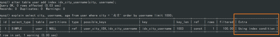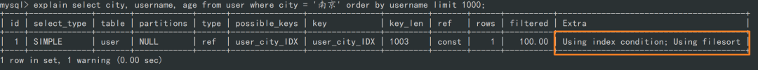 回顾下我们的需求:查询出 city 是 "南京" 的所有 username,并且按照 username 进行排序,返回前 1000 个人的姓名、年龄。