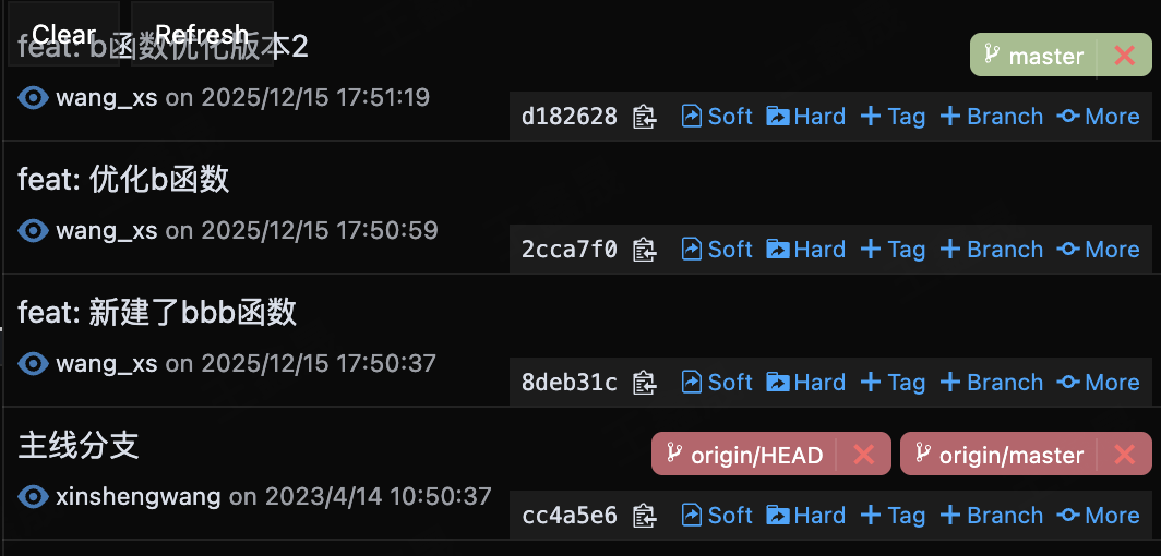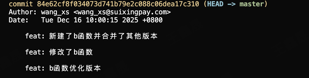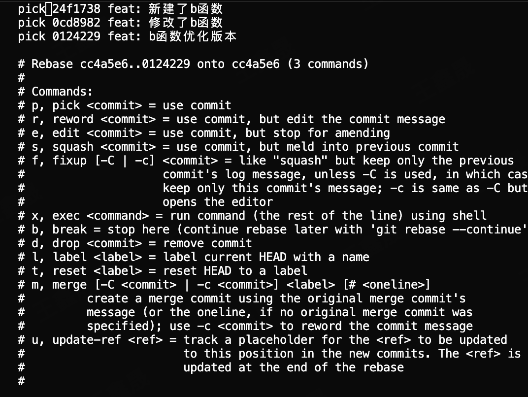 此时我们可以执行的优化操作是 git rebase -i,这个操作是合并我们本地的三个提交,因为可以看出来,我们本地三个提交都是为了优化b函数,那么这三个commit可以直接合并,更多的业务场景是我们在开发统一个需求的时候往往会对应一大堆的提交记录,本质上都是为了同一个需求,我们把本地无意义的commit信息合并之后,就可以在rebase时只处理一次冲突。
