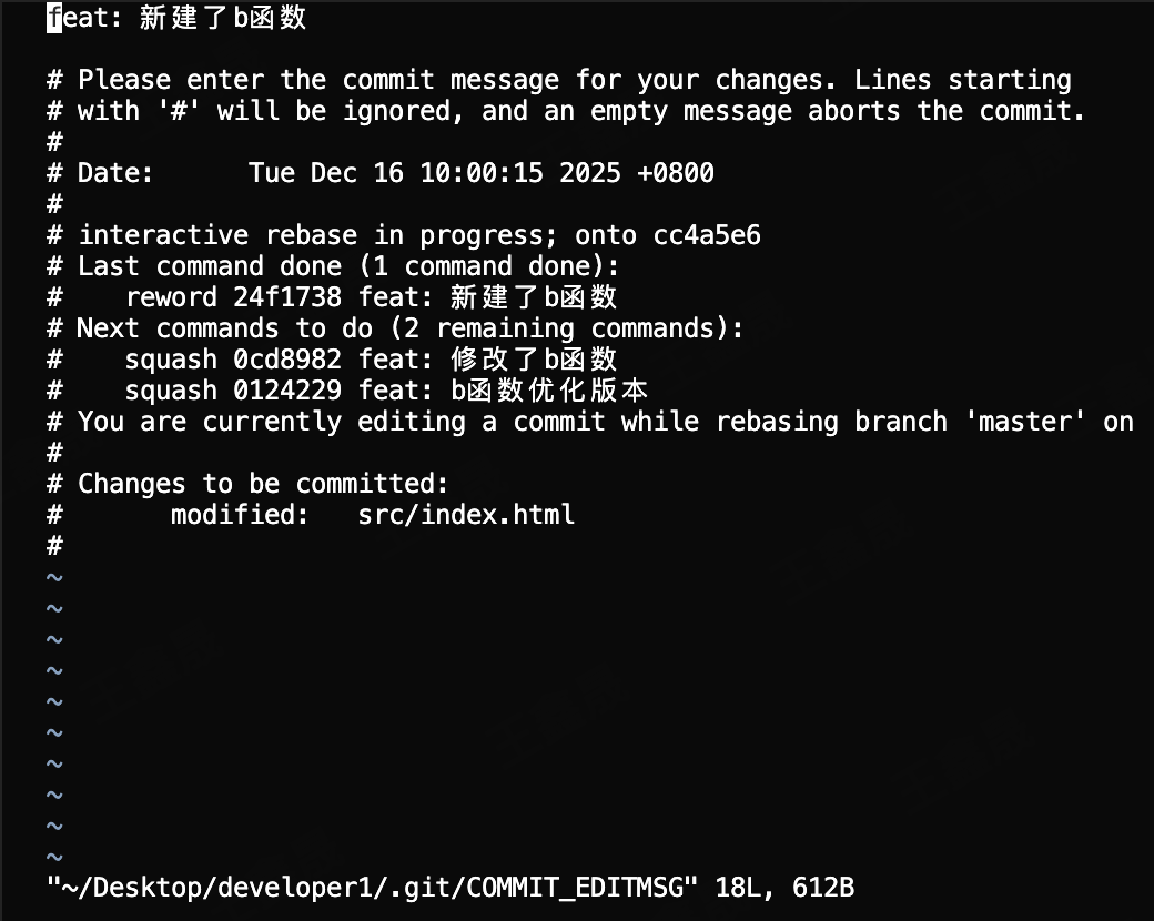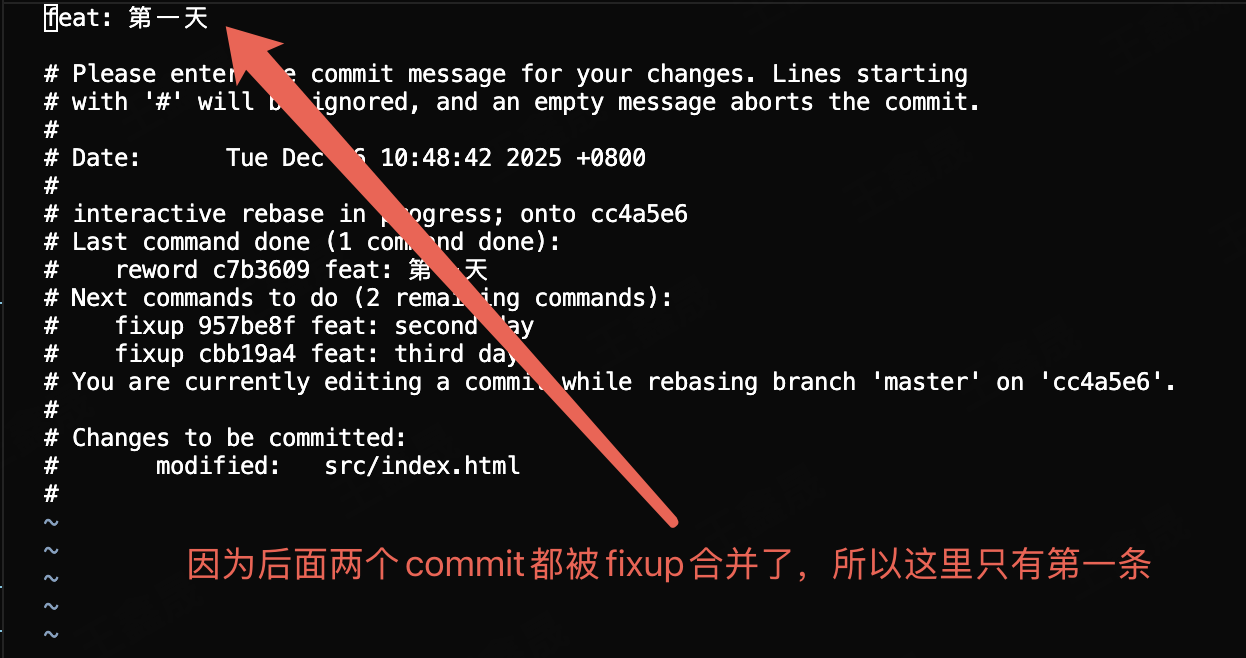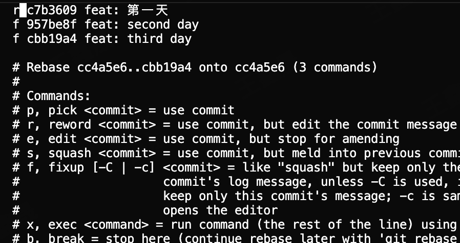 我们并不关心commit信息,想要commit信息和需求强绑定的情况下可以把第一条commit改成r,后面的所有commit改成f(fixup),然后在之后的vim编辑器中修改合并之后的commit信息即可