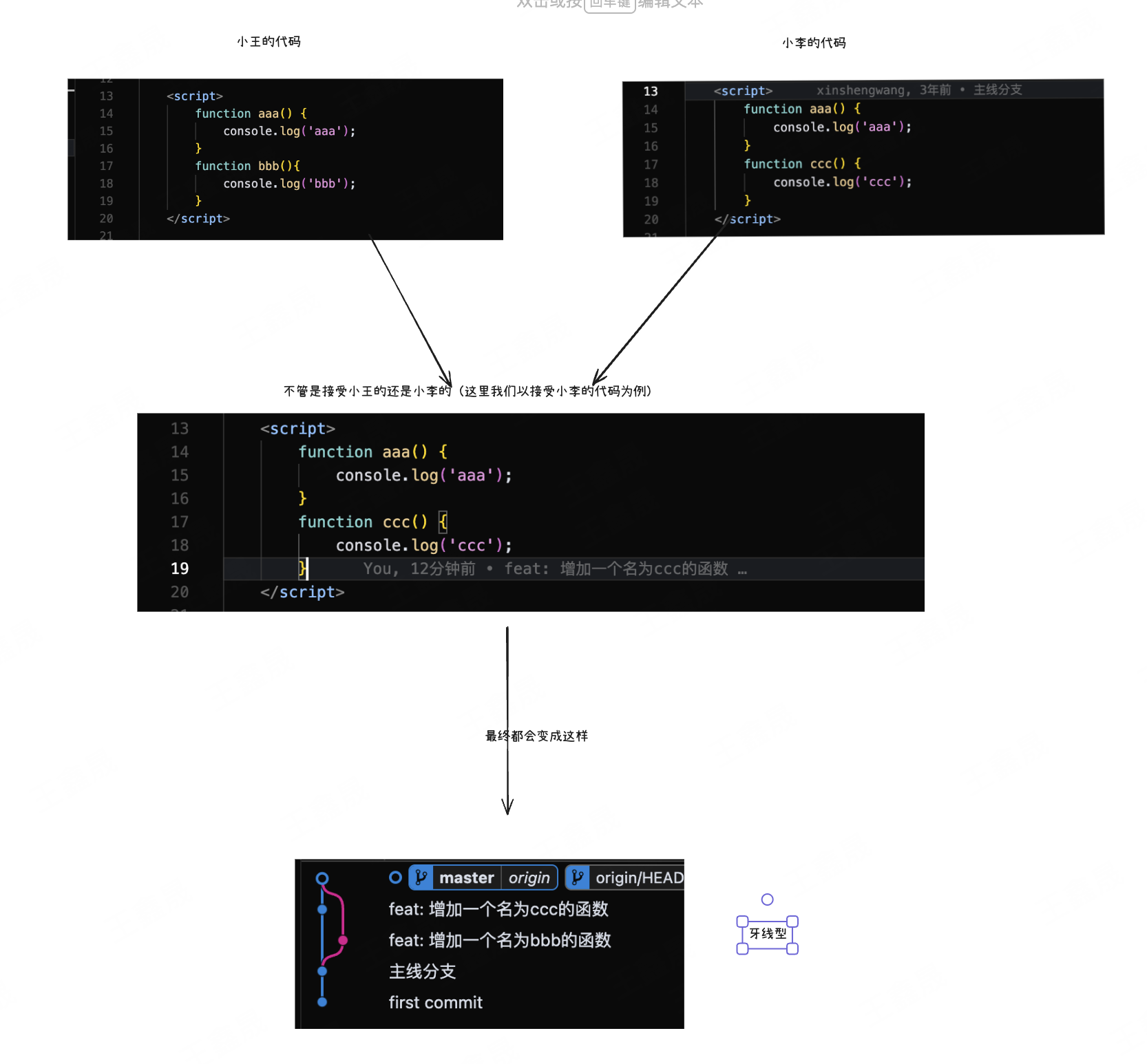 出现这种情况常见的解决方式是小王找到小李一起决策下采取哪一段代码,合并之后推送到远程仓库。相信日常的工作流都是如此