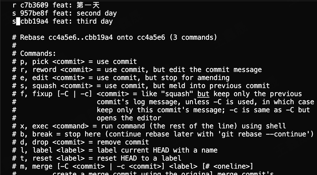 可以看到所有提交记录前都是pick,这里我们把第一条commit改成r(reword),后面的commit全部改成s(squash)
