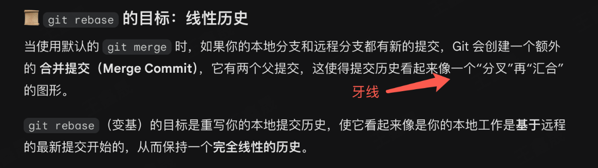 随后,在这一步我们不执行git merge,而是使用rebase大法,rebase的原理是把你本地的代码和远程没有合并的commit逐个比较,比较完成之后把最新的代码放到远程代码的后面,那么合并之后(解决冲突无法避免)的git图示会是一条线形的直观图示。