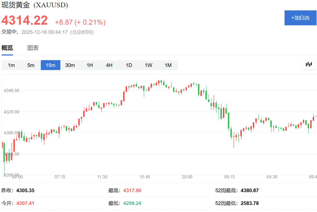 现货黄金周一(12月15日)冲高回落,一度逼近4350美元心理关口,但随后回吐大部分涨幅,收报4305.35美元/盎司,仅微涨0.1%。