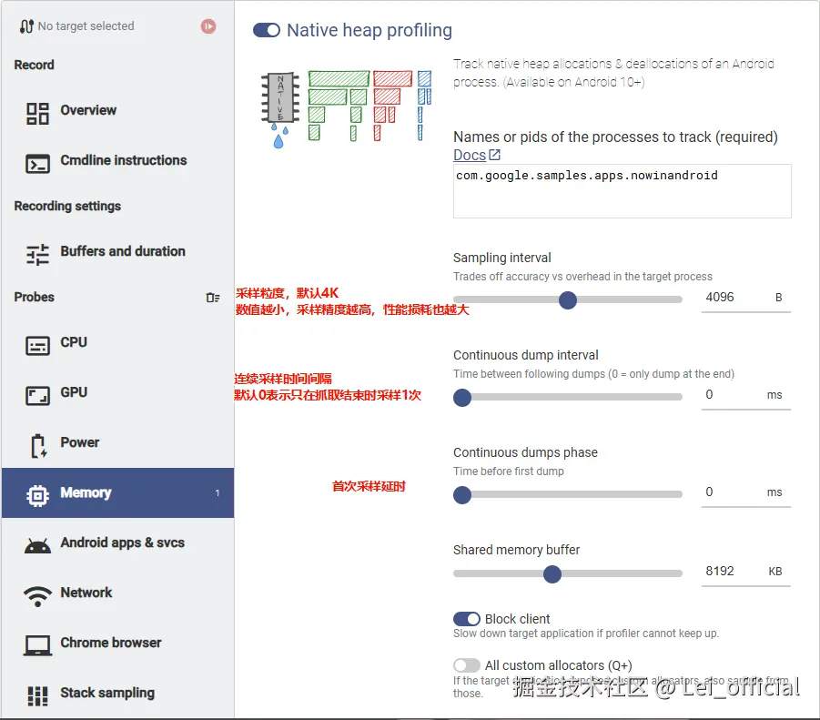 既然是"采样",说明并不是完整记录了全部的内存分配事件,而是 有选择地 。在 Perfetto 中,采样的粒度取决于 sampling_interval_bytes 参数,翻译过来就是 采样区间字节数,其默认值是 4KB,表示 每当内存累计分配超过4KB时,就记录这一次内存申请的函数调用。