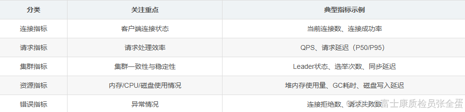 Zookeeper的本质是"高可用的分布式协调服务",它的核心能力是快速处理客户端请求+保持集群一致性。所以监控的核心逻辑就是: