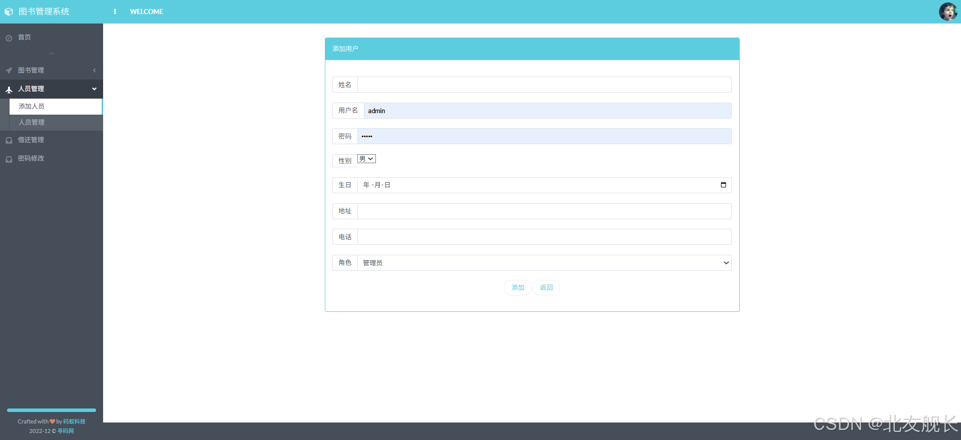 添加用户:填写姓名、用户名、密码、性别、生日、地址、电话,选择角色(管理员 / 读者),完成账号创建。