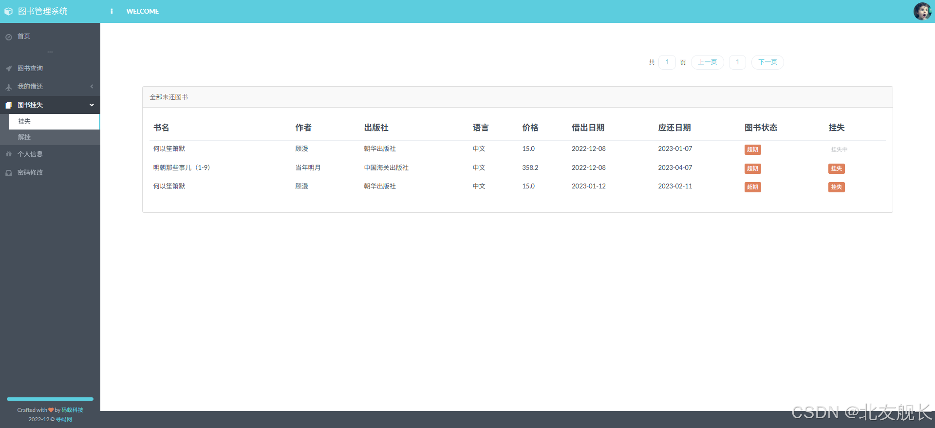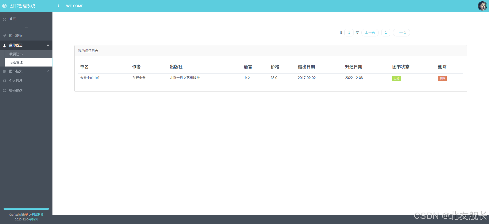 借还日志:查看个人已归还图书的历史记录,删除冗余日志。 - 图书挂失