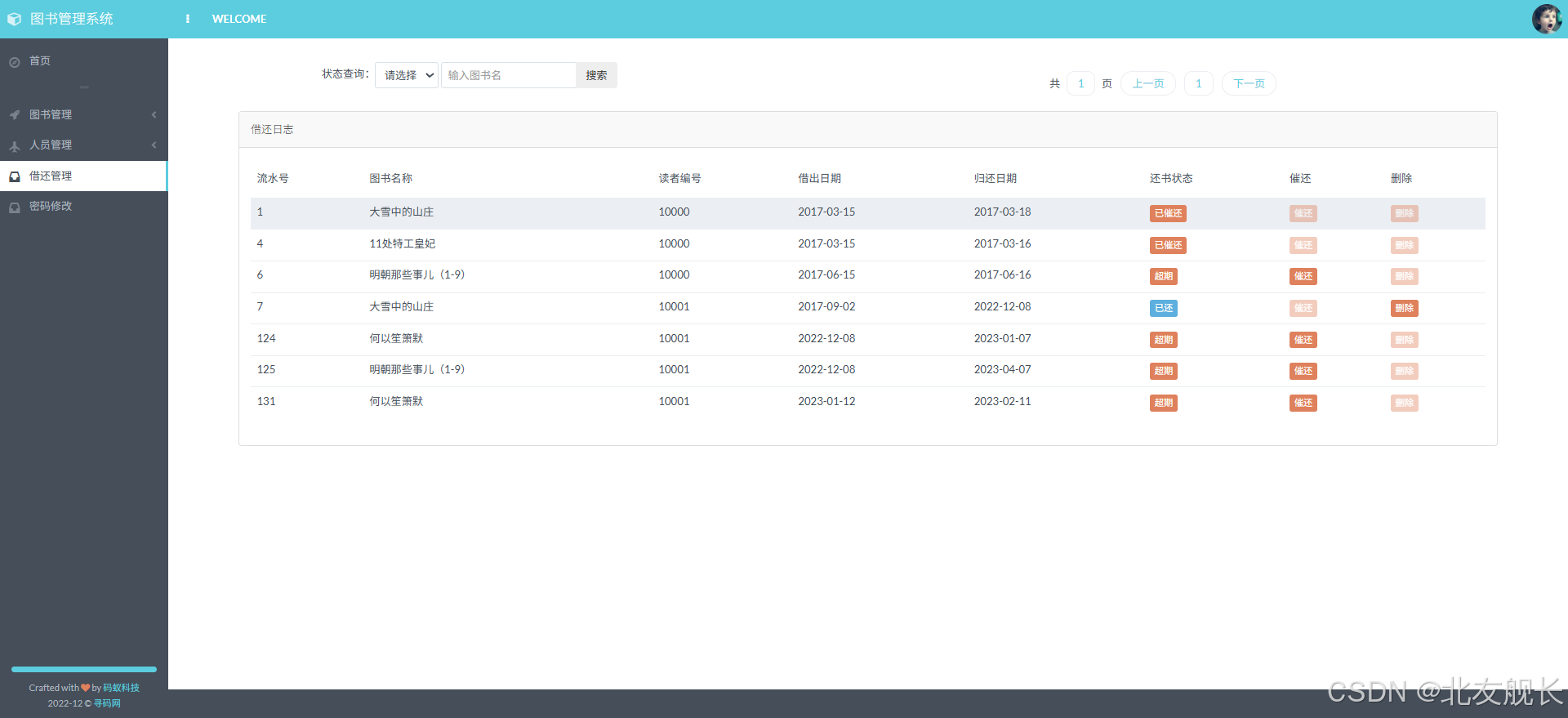 借还日志管理:查看全馆所有借还记录,包含图书名称、读者编号、借出 / 归还日期、还书状态(已归还 / 逾期);