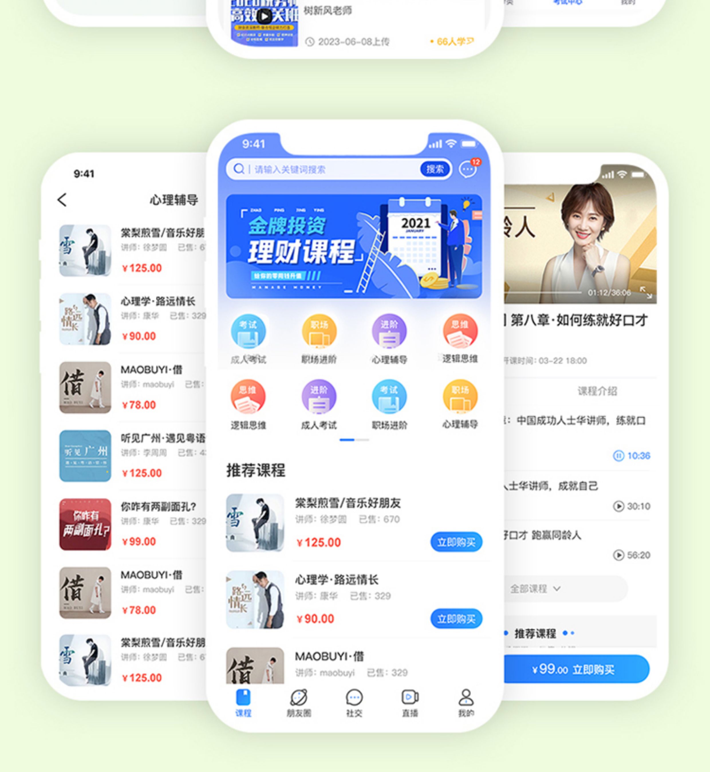 - 用户体系:多角色权限设计(学员、讲师、管理员),JWT token鉴权。