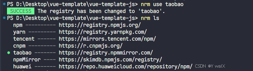 再次运行nrm ls之后会发现前面的*号去了taobao前面,就表示切换到淘宝镜像了
