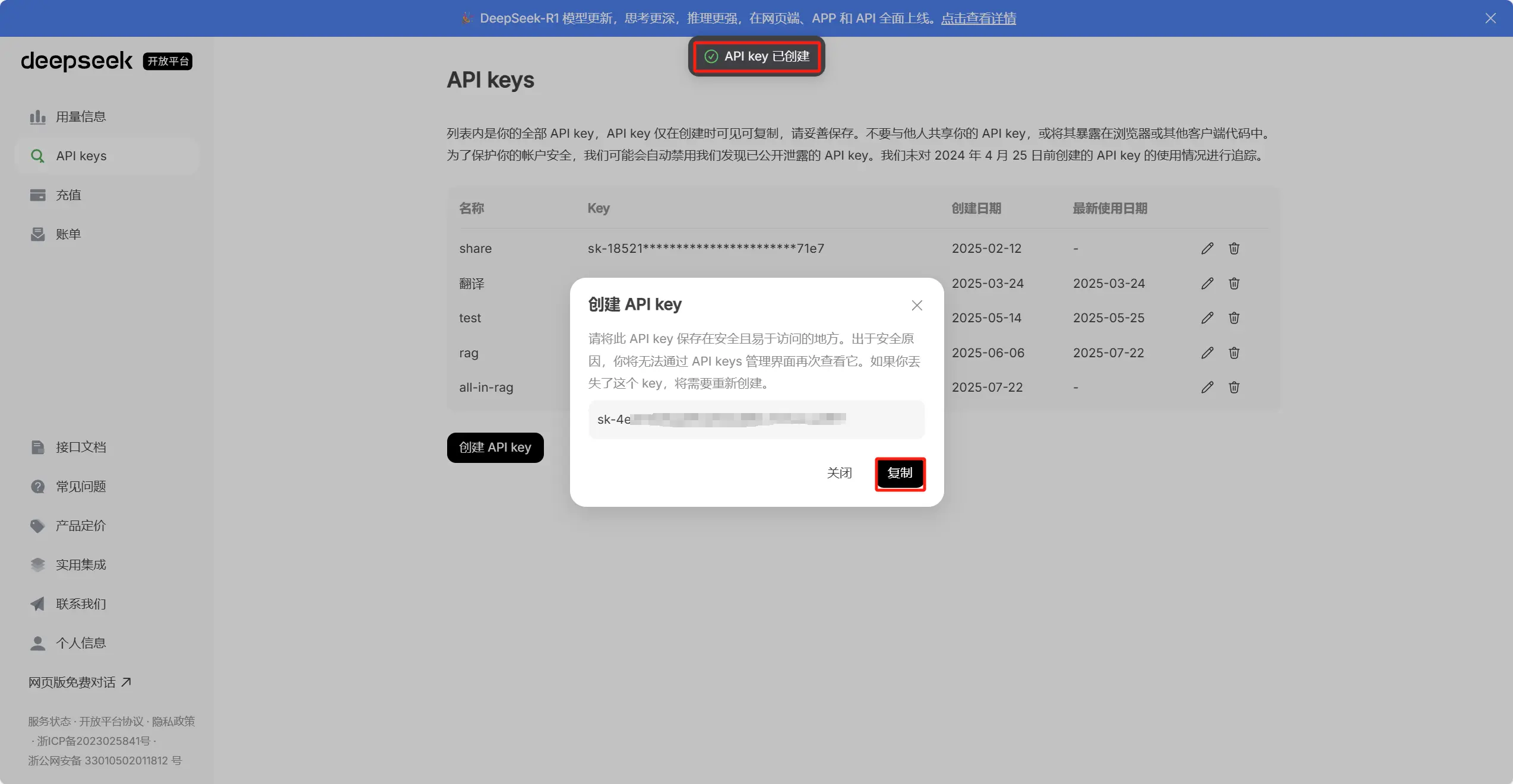 注意:出于安全原因,这个密钥只会完整显示一次,关闭弹窗后就没法再看到了。