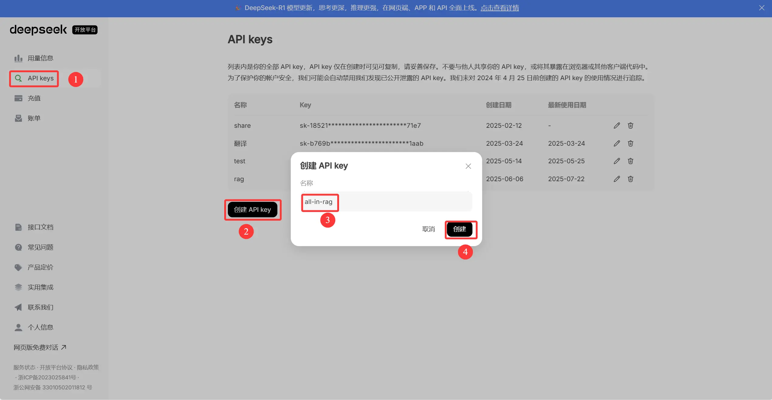 要使用 Deepseek 提供的大语言模型服务,你首先需要一个 API Key。下面是申请步骤: