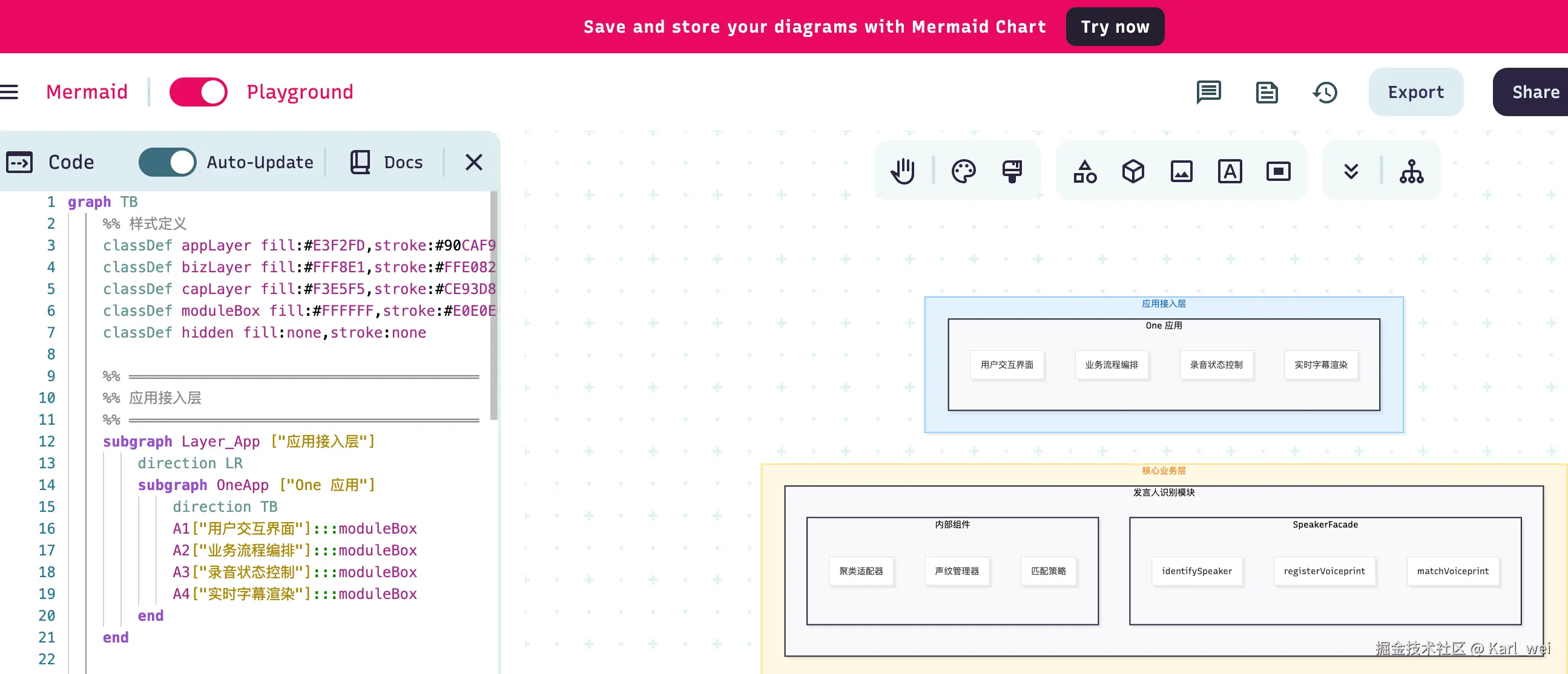 - 图文并茂:在编写文档的时候,时常需要画图,此时可以使用 md 语法来画图。这里我推荐mermaidchart,可以基于 md 语法进行可视化编辑。