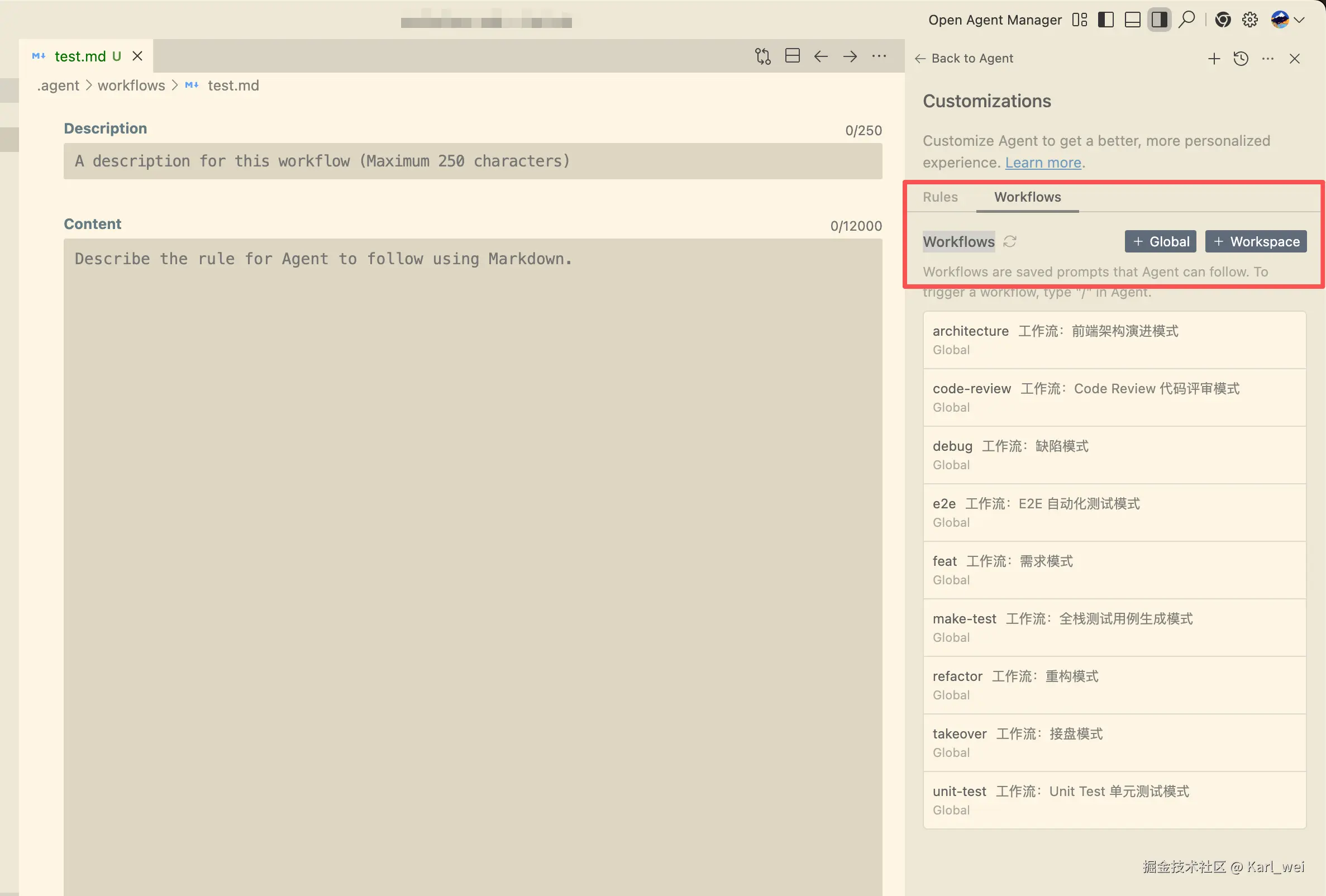 比如,Antigravity就有明确的让我们添加规则和工作流的入口,并且会引导我们如何写提示词,然后在提问的时候,引用对应的文件即可。