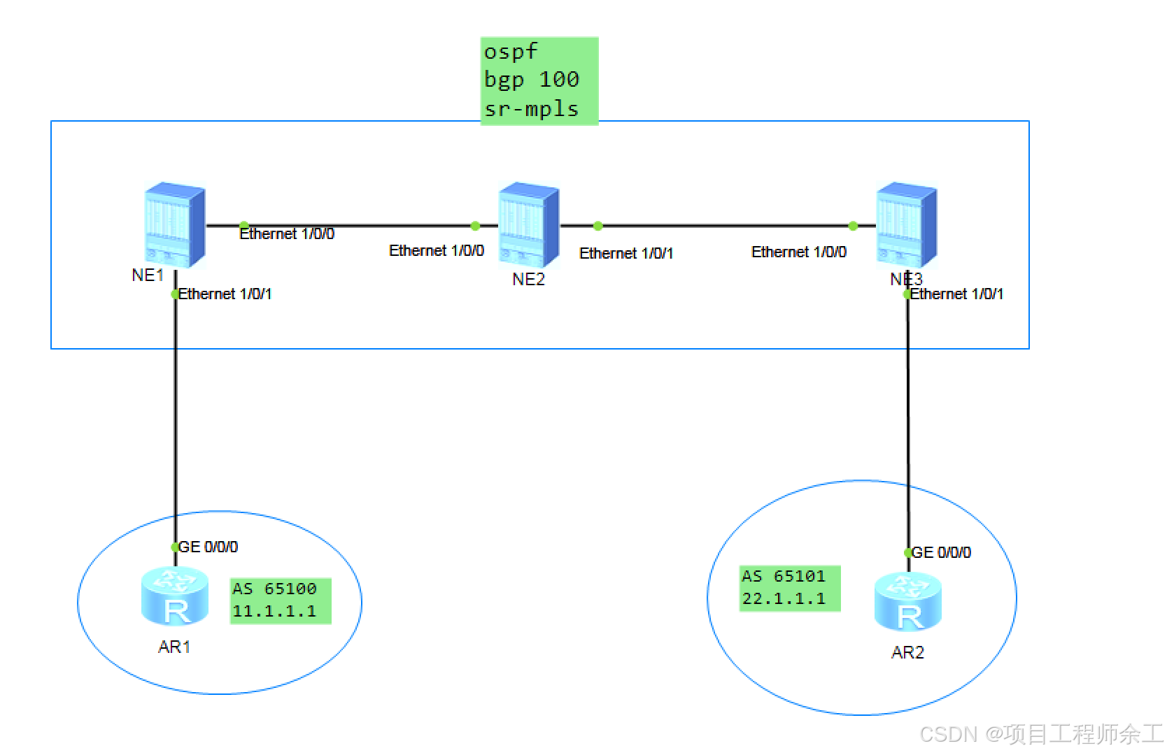 pe1\]dis current-configuration sysname pe1 ip vpn-instance a ipv4-family route-distinguisher 1:1 tnl-policy p1 //调用策略p1 vpn-target 1:1 export-extcommunity vpn-target 1:1 import-extcommunity mpls lsr-id 1.1.1.1 mpls mpls te explicit-path te1 //定义两条显示路径先到NE2设备再到NE3 next sid label 16002 type prefix next sid label 16003 type prefix segment-routing //全局开户段路由功能 interface Ethernet1/0/0 undo shutdown ip address 10.0.12.1 255.255.255.0 ospf enable 1 area 0.0.0.0 undo dcn undo dcn mode vlan interface Ethernet1/0/1 undo shutdown ip binding vpn-instance a ip address 10.0.11.1 255.255.255.0 undo dcn undo dcn mode vlan interface LoopBack0 ip address 1.1.1.1 255.255.255.255 ospf enable 1 area 0.0.0.0 ospf prefix-sid index 1 //本节点node sid偏移值,全局唯一 interface Tunnel1 //配置sr-mpls te隧道接口 ip address unnumbered interface LoopBack0 tunnel-protocol mpls te //指定隧道协议 destination 3.3.3.3 隧道对端地址 mpls te signal-protocol segment-routing //使用SR-mpls te作为标签协议 mpls te tunnel-id 1 //配置隧道ID mpls te path explicit-path te1 //调用显示路径 bgp 100 peer 3.3.3.3 as-number 100 peer 3.3.3.3 connect-interface LoopBack0 ipv4-family unicast undo synchronization peer 3.3.3.3 enable ipv4-family vpnv4 policy vpn-target peer 3.3.3.3 enable //跨设备建立vpnv4邻居 ipv4-family vpn-instance a peer 10.0.11.2 as-number 65100 //和ce建立实例bgp邻居 ospf 1 opaque-capability enable //开10类lsb功能 segment-routing mpls //为sr-mpls分配标签 segment-routing global-block 16000 23999 //srgb标签范围,建议所有设备一致 area 0.0.0.0 mpls-te enable //ospf中开户mpls-te功能 tunnel-policy p1 //定义隧道策略 tunnel select-seq sr-te load-balance-number 1 //显示路径只给一条,不让其负载 NE2配置 \[p\]dis current-configuration sysname p mpls lsr-id 2.2.2.2 mpls mpls te segment-routing interface Ethernet1/0/0 undo shutdown ip address 10.0.12.2 255.255.255.0 ospf enable 1 area 0.0.0.0 undo dcn undo dcn mode vlan interface Ethernet1/0/1 undo shutdown ip address 10.0.23.2 255.255.255.0 ospf enable 1 area 0.0.0.0 undo dcn undo dcn mode vlan interface LoopBack0 ip address 2.2.2.2 255.255.255.255 ospf enable 1 area 0.0.0.0 ospf prefix-sid index 2 interface NULL0 ospf 1 opaque-capability enable segment-routing mpls segment-routing global-block 16000 23999 area 0.0.0.0 mpls-te enable NE3配置 \[pe2\]dis current-configuration sysname pe2 ip vpn-instance a ipv4-family route-distinguisher 2:1 tnl-policy p1 vpn-target 1:1 export-extcommunity vpn-target 1:1 import-extcommunity mpls lsr-id 3.3.3.3 mpls mpls te explicit-path te2 next sid label 16002 type prefix next sid label 16001 type prefix segment-routing interface Ethernet1/0/0 undo shutdown ip address 10.0.23.3 255.255.255.0 ospf enable 1 area 0.0.0.0 undo dcn undo dcn mode vlan interface Ethernet1/0/1 undo shutdown ip binding vpn-instance a ip address 10.0.32.3 255.255.255.0 undo dcn undo dcn mode vlan interface LoopBack0 ip address 3.3.3.3 255.255.255.255 ospf enable 1 area 0.0.0.0 ospf prefix-sid index 3 interface Tunnel1 ip address unnumbered interface LoopBack0 tunnel-protocol mpls te destination 1.1.1.1 mpls te signal-protocol segment-routing mpls te tunnel-id 1 mpls te path explicit-path te2 interface NULL0 bgp 100 peer 1.1.1.1 as-number 100 peer 1.1.1.1 connect-interface LoopBack0 ipv4-family unicast undo synchronization peer 1.1.1.1 enable ipv4-family vpnv4 policy vpn-target peer 1.1.1.1 enable ipv4-family vpn-instance a peer 10.0.32.2 as-number 65101 ospf 1 opaque-capability enable segment-routing mpls segment-routing global-block 16000 23999 area 0.0.0.0 mpls-te enable tunnel-policy p1 tunnel select-seq sr-te load-balance-number 1 结果验证 看路由学习情况   查隧道情况   联通性测试   更多技术细节来全球计算机技术群,一起讨论学习!