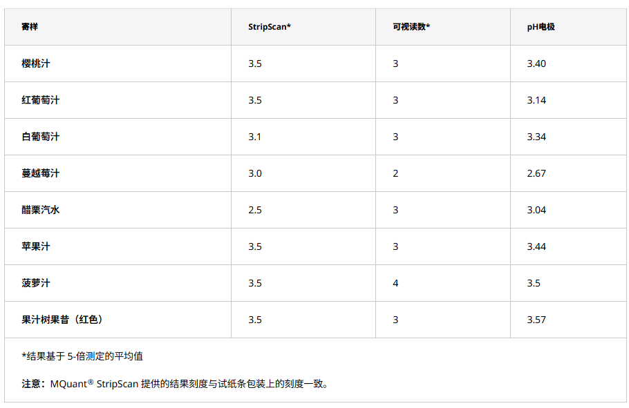 表 1 对比使用试纸条目测结果,使用StripScan读取结果以及使用pH电极测量 8 种果汁的pH值。