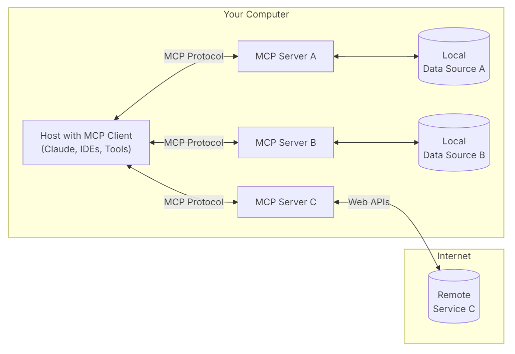 - 远程服务 (Remote Services):可通过互联网访问的外部系统(例如,通过 API),MCP 服务器可以连接到这些系统