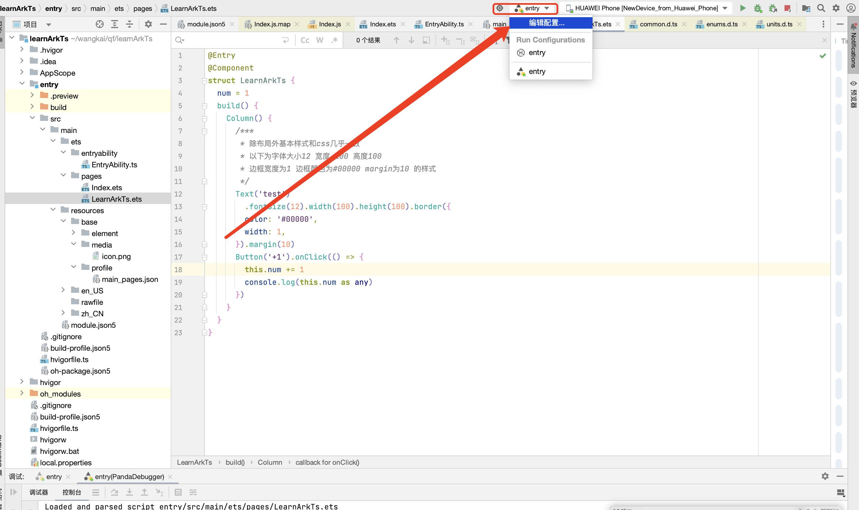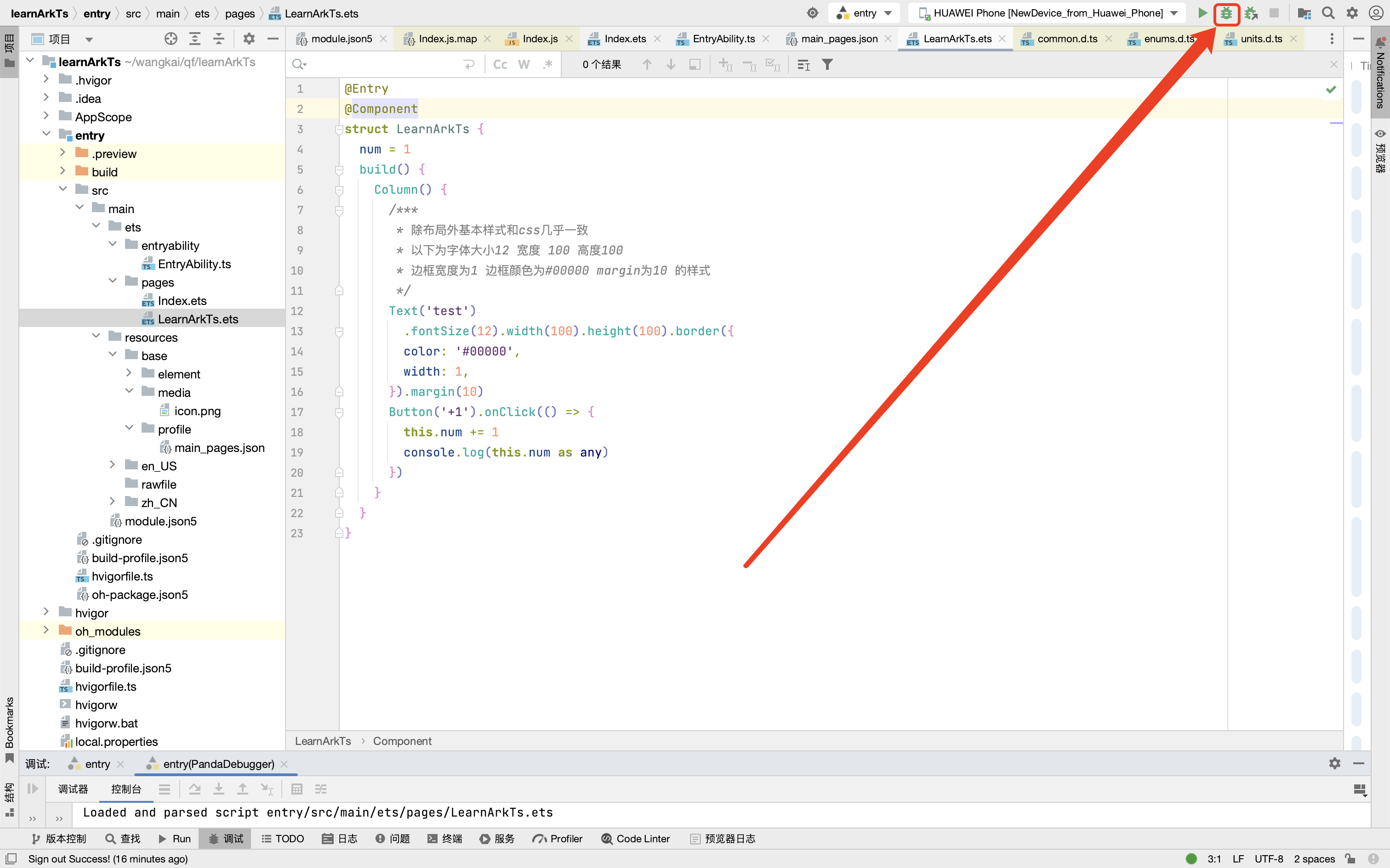 注意:提前打开模拟器,代码修改后需要重新点击进行调试