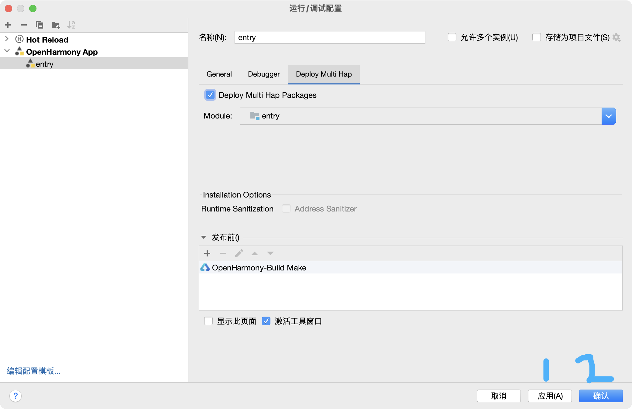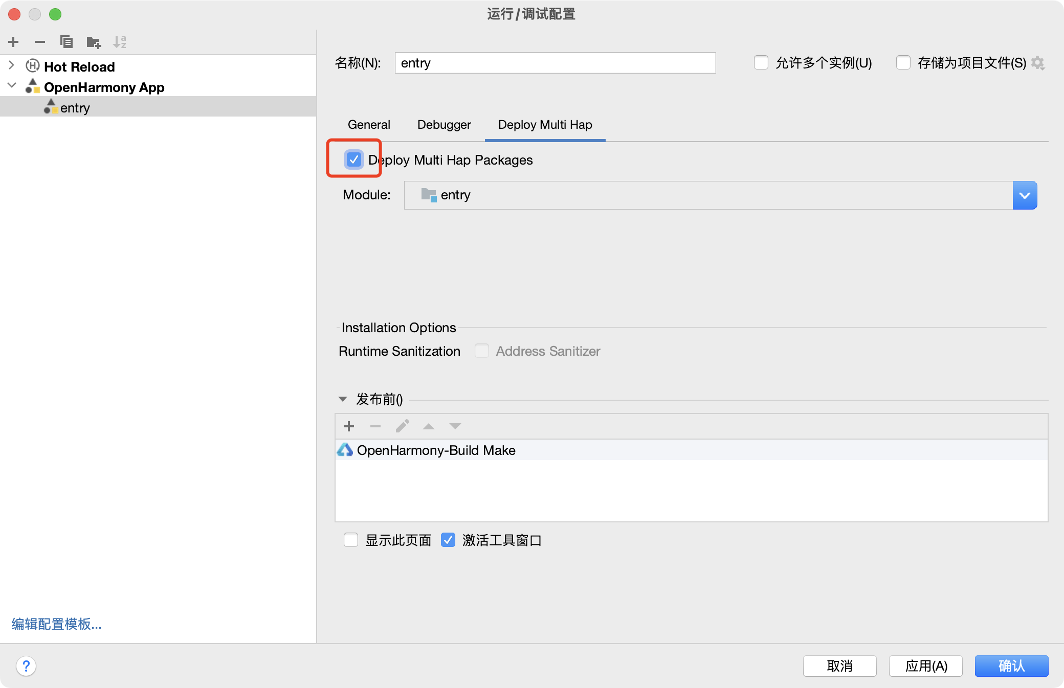 如果一个工程中同一个设备存在多个模块(如Phone设备,存在entry和feature模块),且存在模块间的调用时,在调试阶段需要同时安装多个模块的hap包到设备中。此时,需要在Deploy Multi Hap中选择多个模块,启动调试时,DevEco Studio会将所有的模块都安装到设备上。DevEco Studio V3.1 Release开始支持