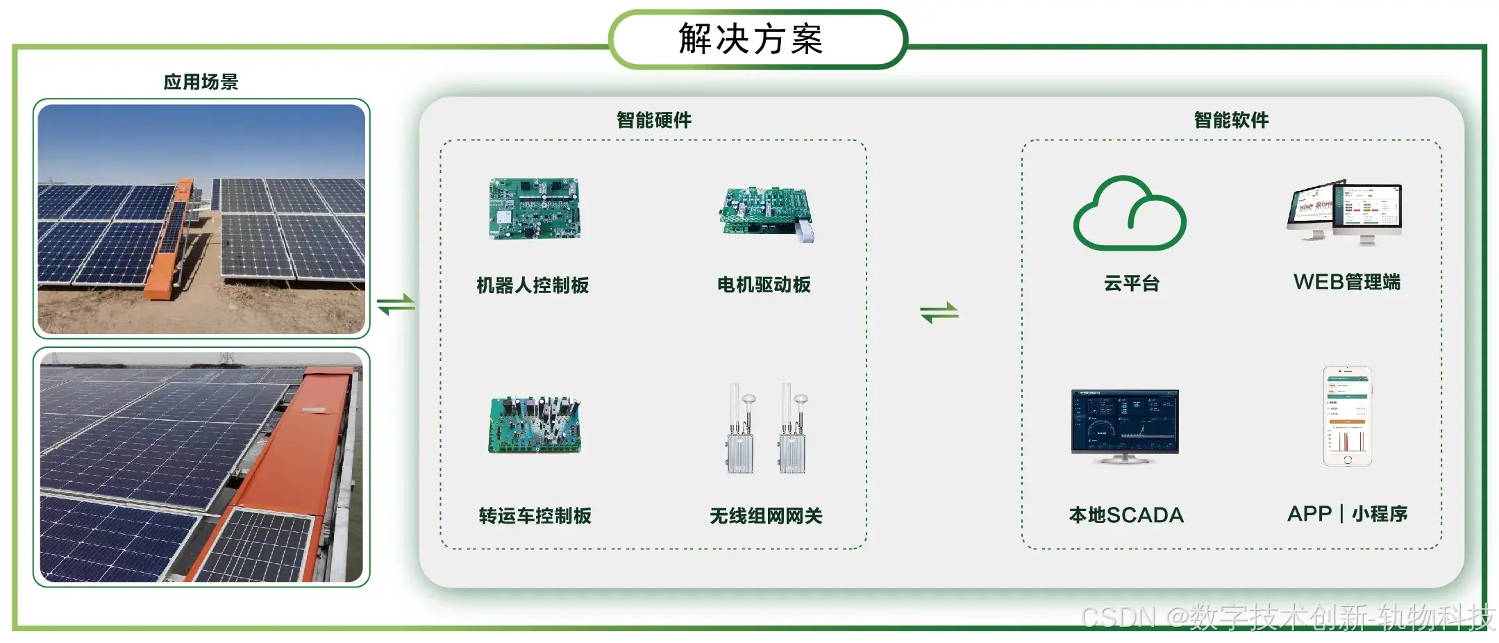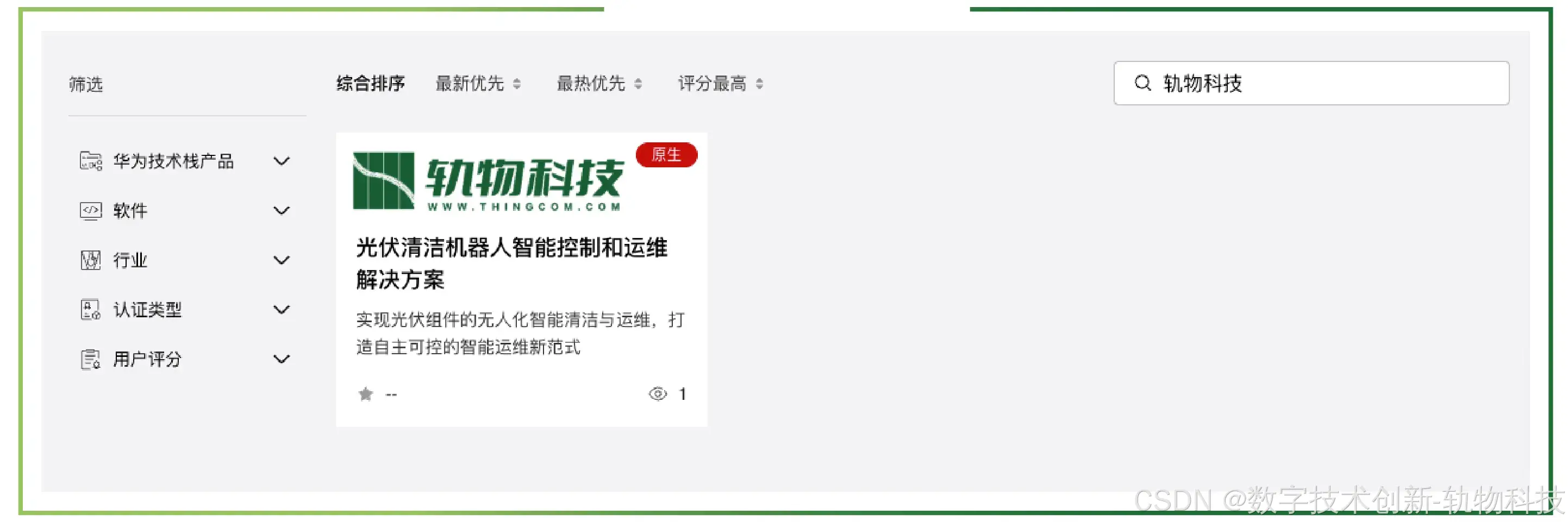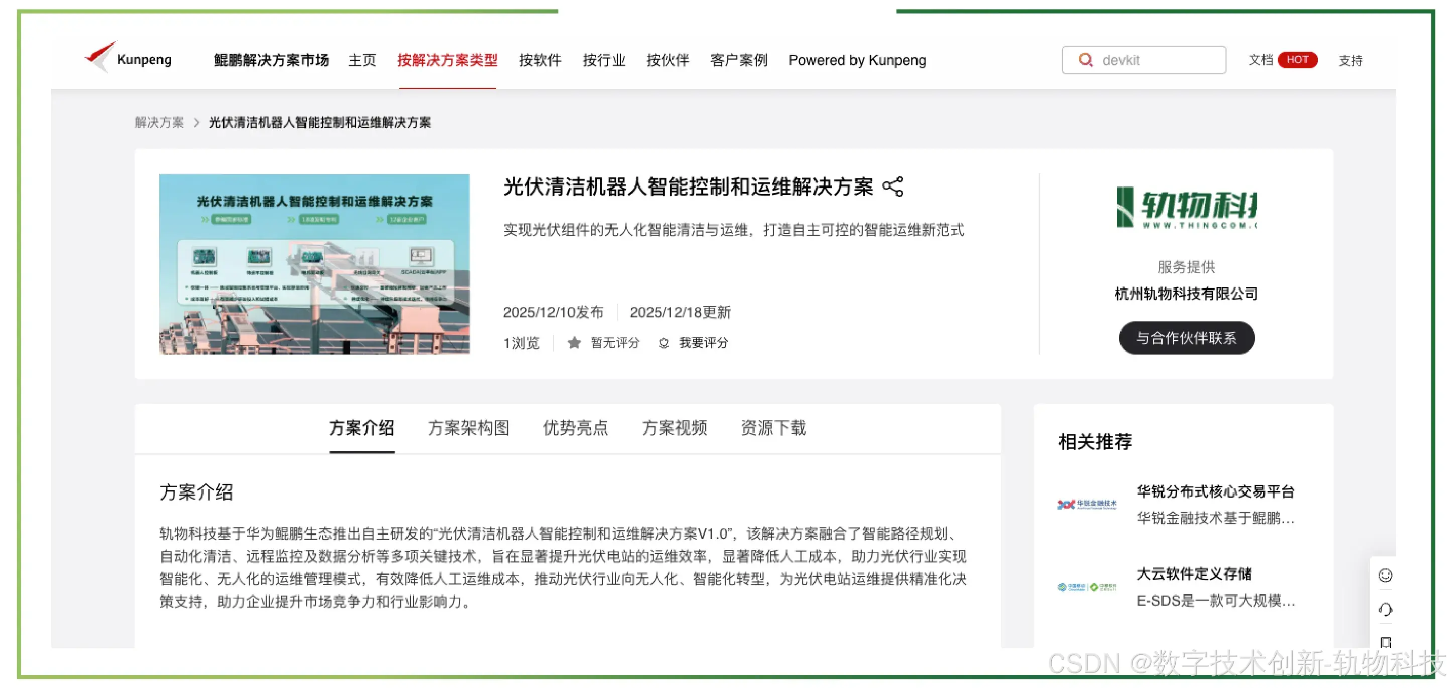 2025年12月18日,轨物科技自主研发的"光伏清洁机器人智能控制和运维解决方案V1.0 "正式上线华为鲲鹏解决方案市场 ,标志着轨物科技在新能源运维智能化 领域迈出了重要一步。该解决方案深度融合华为鲲鹏生态技术,以创新科技赋能光伏行业,为全球光伏电站提供高效、精准、安全的智能化运维新范式。